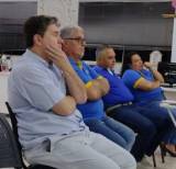 Audiodescrição: na foto, imagem e uma sala, ao fundo, um telão na parede, uns banners lateral direita, lado esquerdo armario uma mesa com computador o pavilhão de bandeiras, na frente do pavilhão, um senhor com camiseta azul do Rotary em frente uma tribuna de madeira, do lado esquerdo dele, uma senhora sentada numa cadeira e uma mesa branca em frente. No centro da foto, uma essa grande com toalha branca, em cima dela o sino rotário e de frente um homem de óculos, camiseta azul do Rotary, ele parece estar falando algo e gesticula com a mão.