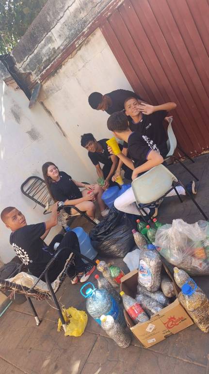 Na foto 6 adolescentes identificados: 5 meninos e 1 menina. Todos vestem camiseta e escura iguais. A maioria está sentada em cadeiras de alpendre de cordinhas. Eles estão à volta de várias embalagens plásticas com lacres de latinha dentro. O lugar parece parece ser fechado.