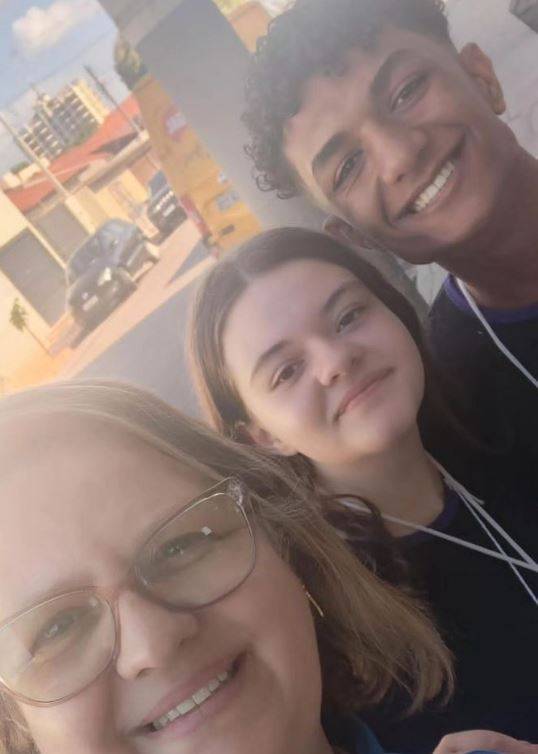 Na foto vários jovens entre moças e rapazes são identificados. A grande maioria veste camiseta igual escura com crachá de papel pendurado no pescoço e estão posicionais de pé e curvados pra frente e exceto uma jovem e um jovem que vestem camiseta rosa,a última pessoa posicionada é uma jovem mulher loira sorridente que veste camiseta azul do Rotary .