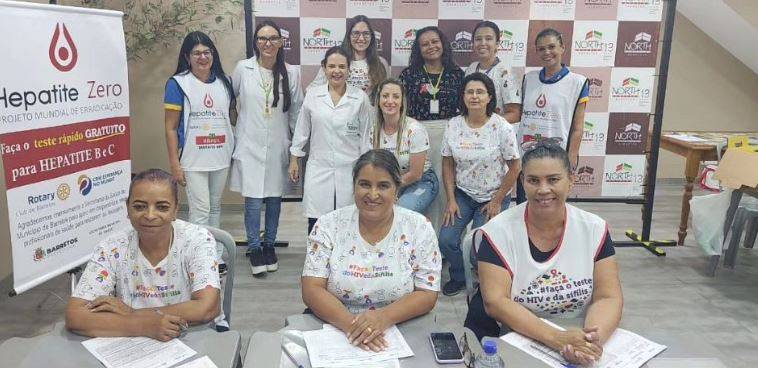 No banner existe várias informações, o símbolo do Rotary e a logo da gestão atual. Todos vestem colete branco do programa Hepatite Zero e sorriem discretamente.