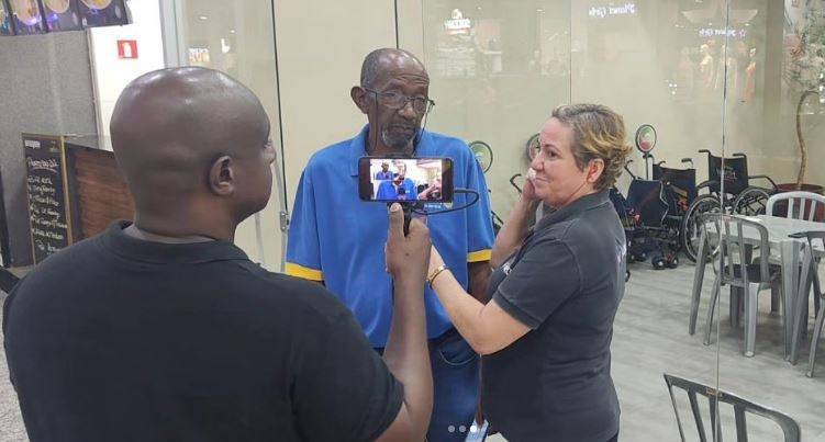 Na foto 5 pessoas detectadas: 2 mulheres do lado esquerdo e 2 do lado direito. No centro um homem de cabelo e barba grisalha usando óculos. Ele está ao lado de um banner do Hepatite Zero.