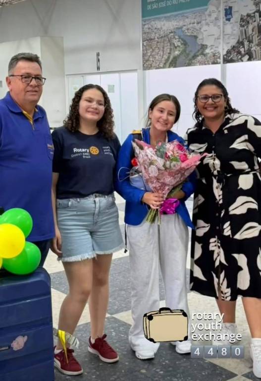 A imagem mostra quatro pessoas reunidas em um ambiente interno que parece ser um aeroporto ou espaço público. No centro-direita está uma jovem mulher segurando um grande buquê de flores. Ela veste um blazer azul decorado com diversos pins coloridos, típico de participantes do programa de intercâmbio Rotary Youth Exchange. Ao redor dela, três pessoas sorriem e parecem estar celebrando ou dando as boas-vindas à jovem.