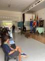 Na imagem, vemos um auditório escolar com várias crianças sentadas em cadeiras de plástico preto, assistindo a uma apresentação. À frente, há um palco pequeno, com um homem de camiseta azul e calça jeans em pé, segurando um microfone e falando ao público.