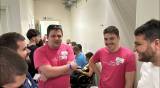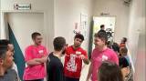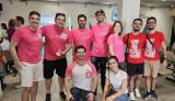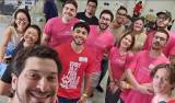 Foto com sete jovens de pé lado a lado e outros dois agachados na frente. A maioria deles veste camisetas cor de rosa e bermudas. Todos tem sorrisos discretos nos lábios. Eles estão em local fechado com outras pessoas atrás. O local possui pilares e focos de luz nas paredes claras.