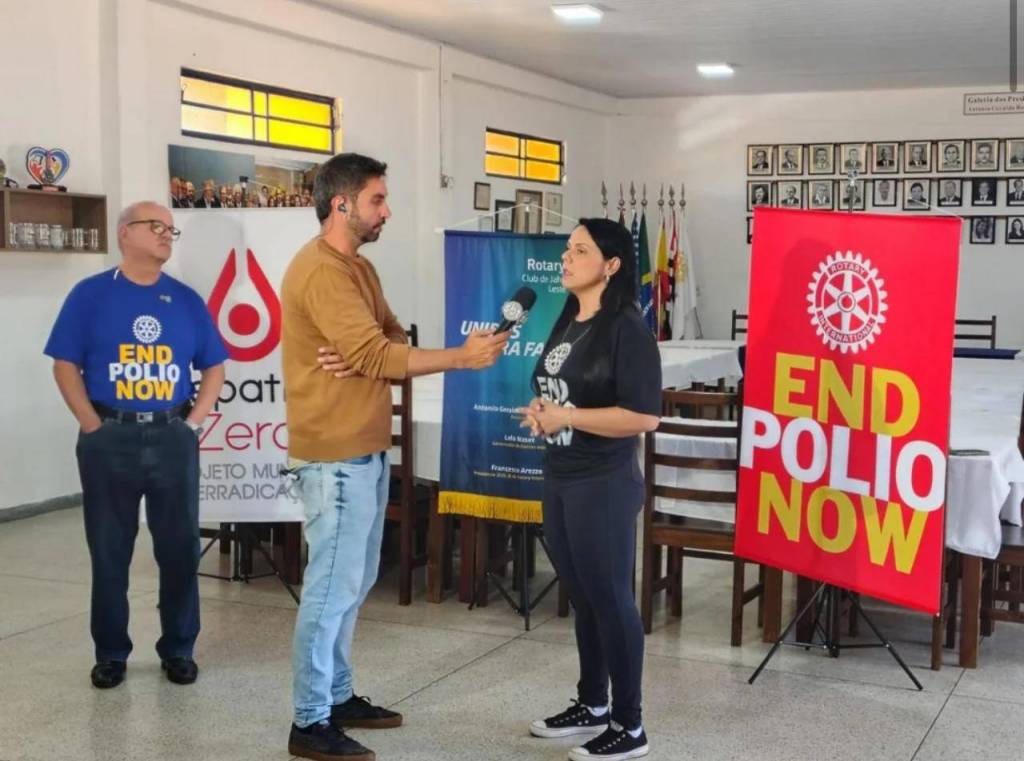 Três pessoas estão em uma sala preparada para um evento comunitário ou institucional. Um homem segura um microfone e entrevista uma mulher, enquanto outro homem observa ao lado. Todos estão vestidos de forma casual. O ambiente tem mesas e cadeiras organizadas em estilo de reunião, com banners e cartazes relacionados ao Rotary Club e à campanha End Polio Now.