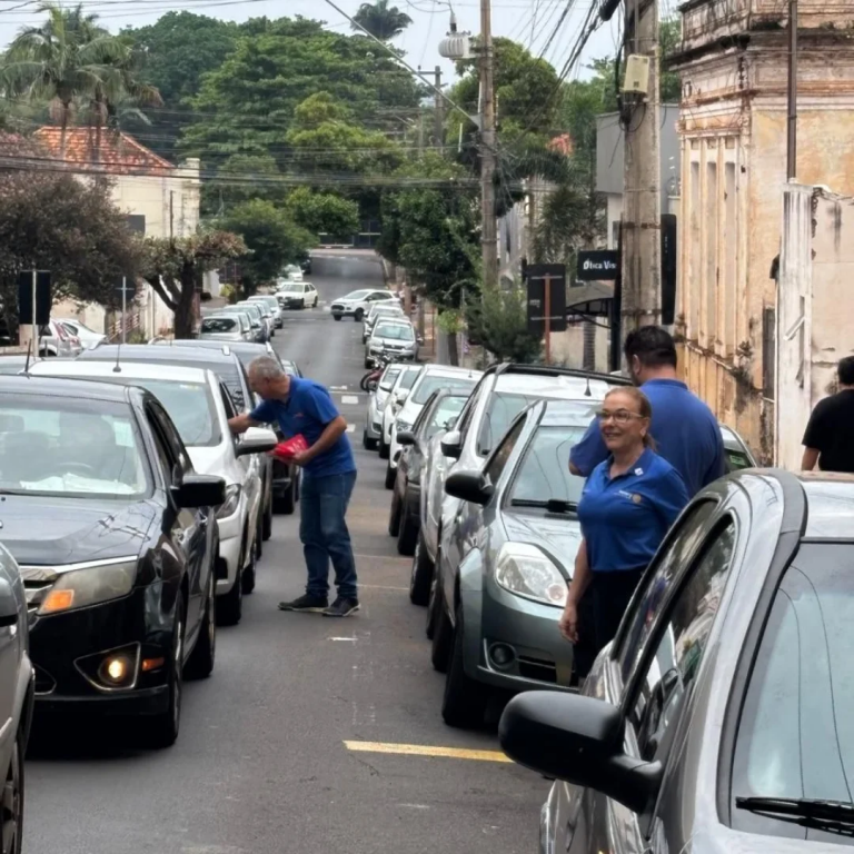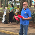 Um homem maduro, careca e de óculos, vestindo uma camiseta azul com o emblema do Rotary (visível no ombro esquerdo) e calça jeans. Ele está de costas ou em leve perfil para o observador. Ele estende o braço direito, segurando algo de cor vermelha (possivelmente um folheto) para o interior de um carro.