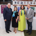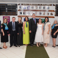 As pessoas estão posando para umas fotografias em ambiente interno. Estão vestidos com roupas formais: os homens usam ternos escuros e as mulheres vestem vestidos elegantes.
