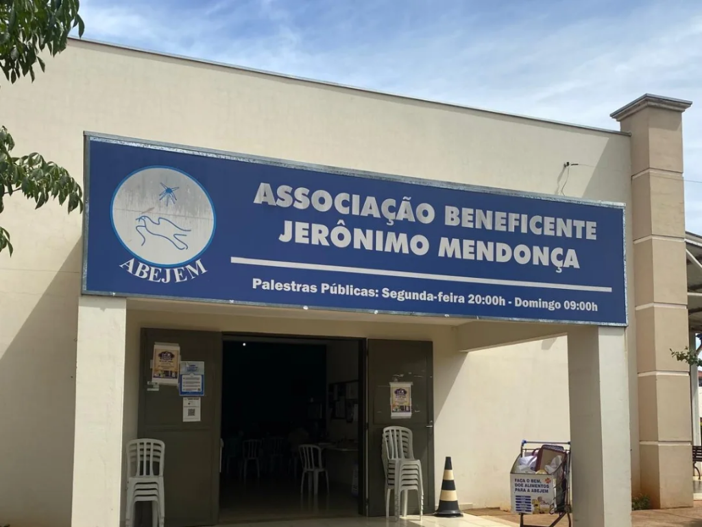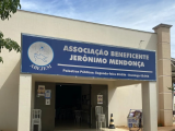 Em outra imagem, a fachada da Associação Beneficente Jerônimo Mendonça é mostrada. Há uma placa azul com o nome da instituição e o logotipo de uma pomba branca.