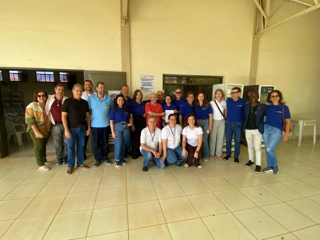 O grupo é composto por homens e mulheres, a maioria vestindo camisetas azuis com o logotipo do Rotary. As fotos foram tiradas em ambientes internos e externos da instituição.