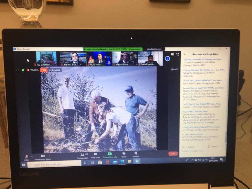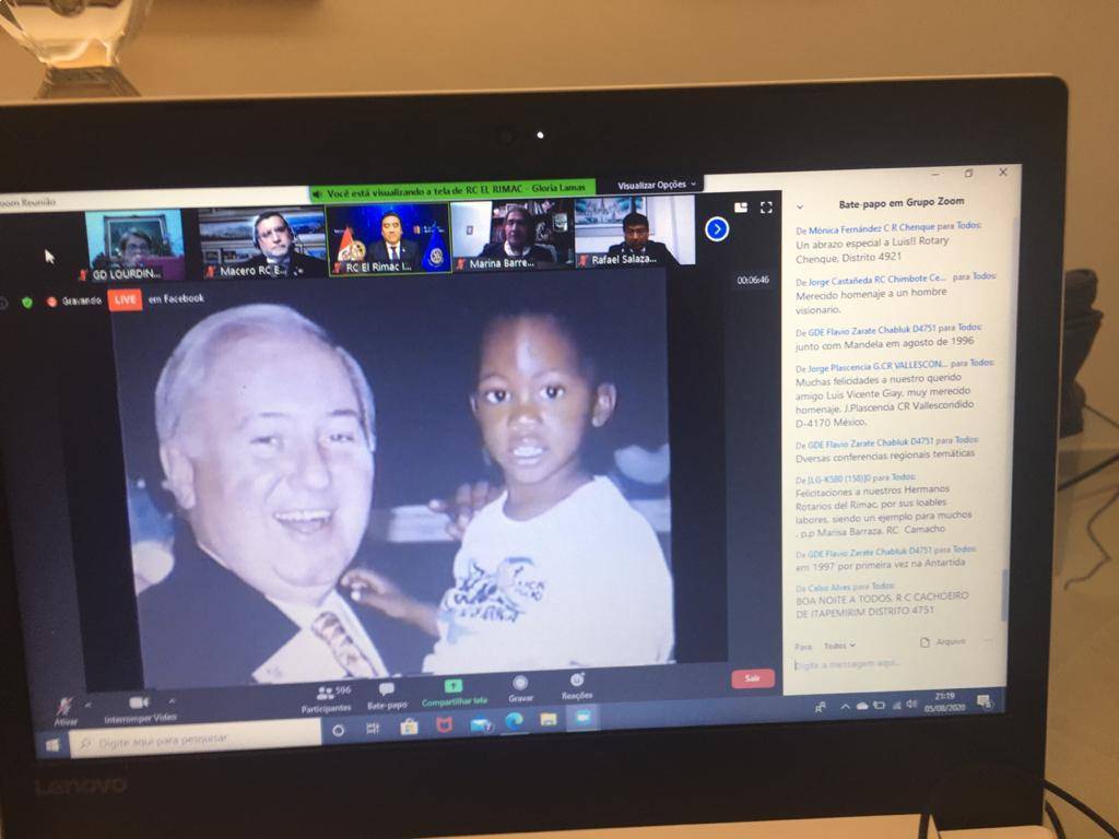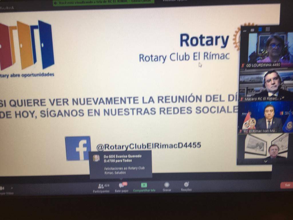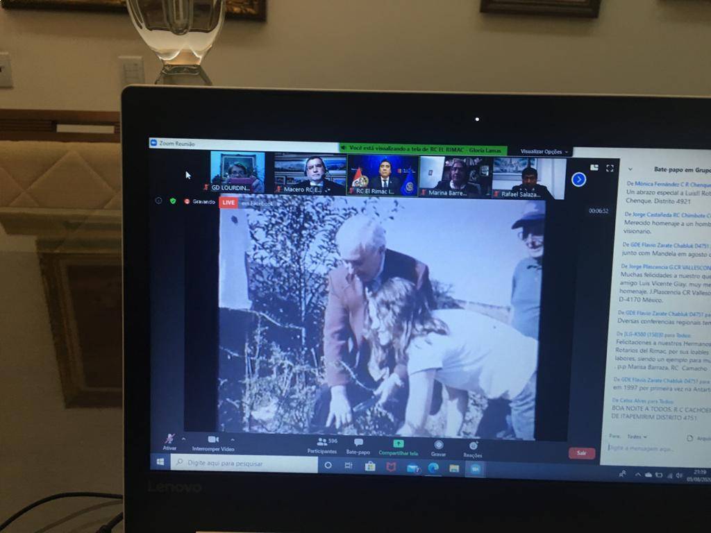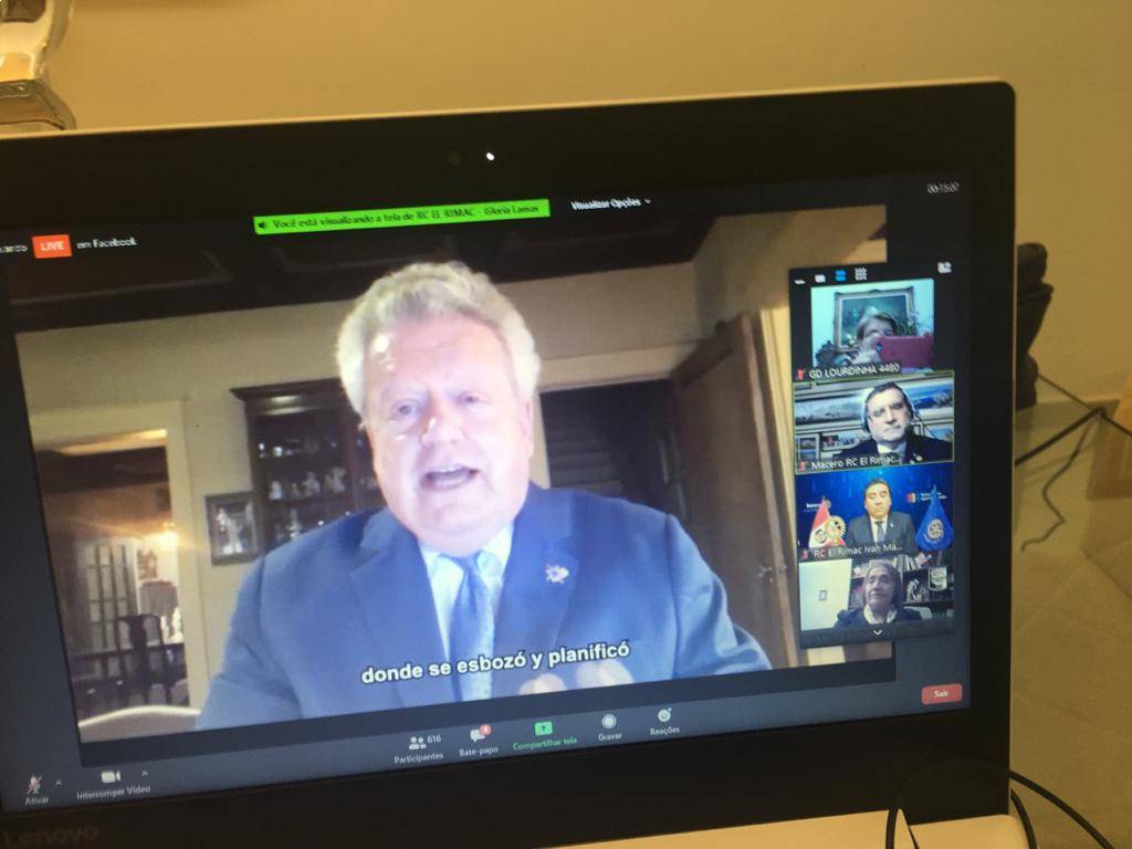 A governadora do Distrito 4480, Lourdinha Serpa Dalto, participou, neste dia 5 de agosto, de reunião promovida pelo Rotary Club de El Rimac, do Peru, em homenagem ao ex-presidente do Rotary International, Luis Vicente Giay (1996-97). Em seu ano rotário, o lema foi “Construa o Futuro com Ação e Visão”. Estiveram presentes, virtualmente, todos os presidentes do RI. Giay é de Buenos Aires – Argentina e foi também presidente da Fundação Rotaria (2006-07).
